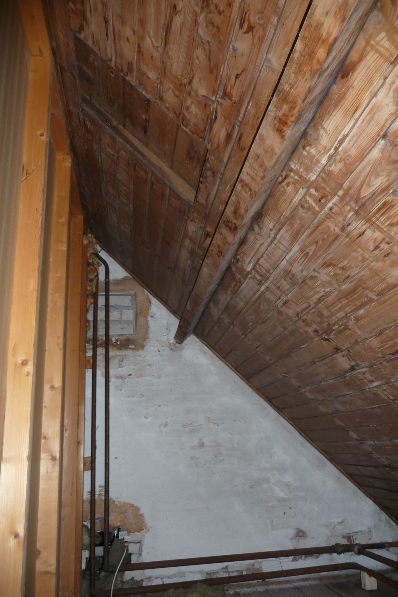 Ook de tweede opening in het oostelijke dakvlak was aan de buitenzijde niet meer zichtbaar door een vernieuwd pannendak. Maar binnen zijn de plaatsen van beide voormalige luikjes of raampjes nog goed te zien. Zie foto nr. 3. De op 7 juli as. in het schip aanwezige gidsen zijn over een en ander goed geïnformeerd, zullen graag de voormalige geheime ruimte op de eerste verdieping laten zien en vertellen over wat hen bekend is. De koker waar volgens een ander krantenartikel wapens e.d. in werden verstopt is mogelijk de als witte schoorsteen uitziende schuine koker en heb ik wel gefotografeerd, zie foto nr. 4, maar nog niet opengebroken en geïnspecteerd.