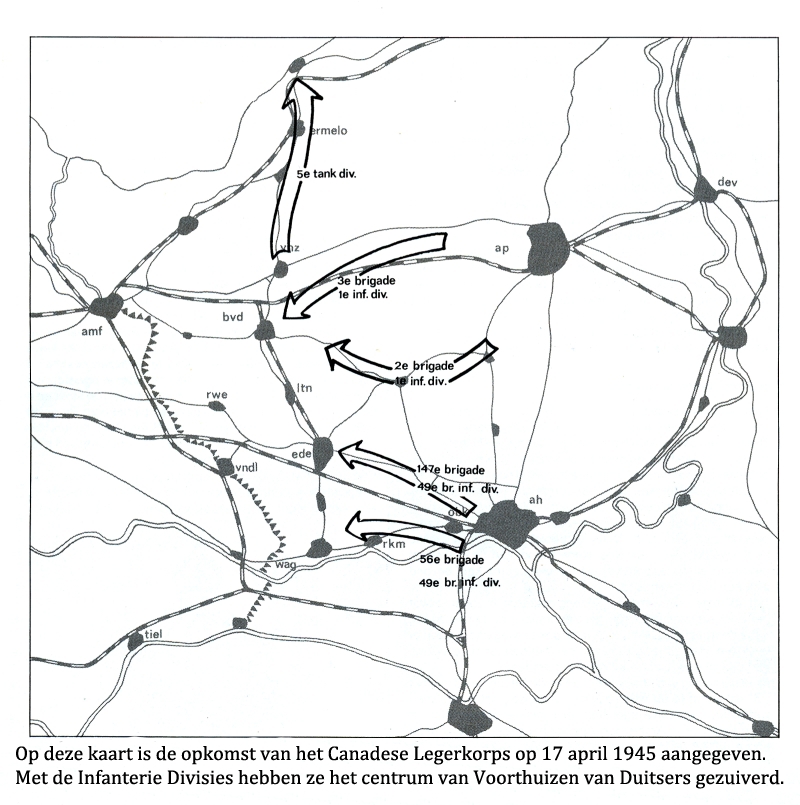 Mien van den Broek (29) 87 jaar, vertelde dat ze op dinsdagochtend al om 7 uur in het land bij de Coöperatie koffie hebben gedronken met de bevrijders. De familie moest daarna de kelders weer in want de Canadezen zouden Voorthuizen intrekken. “De tanks reden door de landerijen, tussen de gebouwen van de voormalige Coöperatie en het voormalige Station door en vervolgens door het land van Gaasbeek (nu de Zeeheldenbuurt) in de richting van de Punt. Maar wij zelf werden pas die middag bevrijd. De Duitsers vluchten toen via de Buurtweg (34) in de richting van Lankeren (35) terwijl de Canadezen hen nog vanaf de Rijksweg en Noordersingel achterna schoten. Bij de familie Bos aan de Appelseweg hebben de Canadezen toen zelfs nog de voorgevel van het huis kapot geschoten. Wij hebben later nog vaak de Canadezen op bezoek gehad die bij de bevrijding betrokken waren geweest”.
