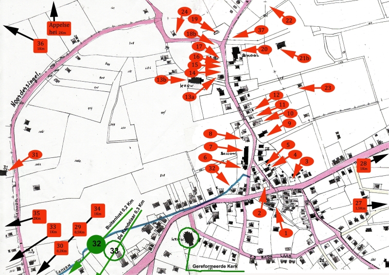 Voor dit artikel werden geïnterviewd, zie foto’s en kaart van het dorp van kort na de oorlog: