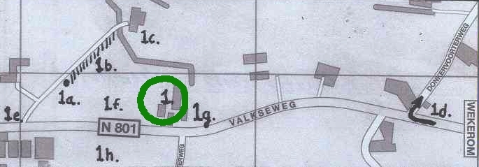 Hoewel ik vorig jaar, evenals later, uiterst voorzichtig ben geweest met data en tijdstippen en mijn concept voor alle zekerheid meerdere malen had verbeterd en aan de betreffende geïnterviewden ter goedkeuring had voorgelegd had ik zondag toch niet mogen “verbeteren” in maandag. Dat bleek al toen ik mevrouw Van Beek vorig jaar juni een exemplaar van Oud Barneveld nr. 85 met mijn verslag van de bevrijding bracht. Ze keek het meteen in en zei: ”Maar ik had je toch verteld dat de Canadezen al op zondag 15 april hier waren”. Ze vertelde toen weer dat de Canadezen al in de late zondagnamiddag door haar man bij hen op het erf van de boerderij waren gezien. Haar man had tegen haar gezegd ”Dat zijn geen Duitsers, dat zijn Engelsen”. Even later hadden er achter de boerderij weer Duitse militairen gelopen en deze hadden tegen haar man erg vervelend gedaan. Er stond toen namelijk een Duits kanon met bezetting op slechts 250 meter van de boerderij in de richting van Barneveld opgesteld. Dat kanon stond iets verdiept opgesteld bij (1a) aansluitend aan het begin van de houtwal (1b) langs de oprit naar de boerderij van toen de familie Davelaar (1c), zie kaartje. Dat kanon stond daar ook al op zondag de Canadezen, die uit Otterlo werden verwacht, op te wachten.